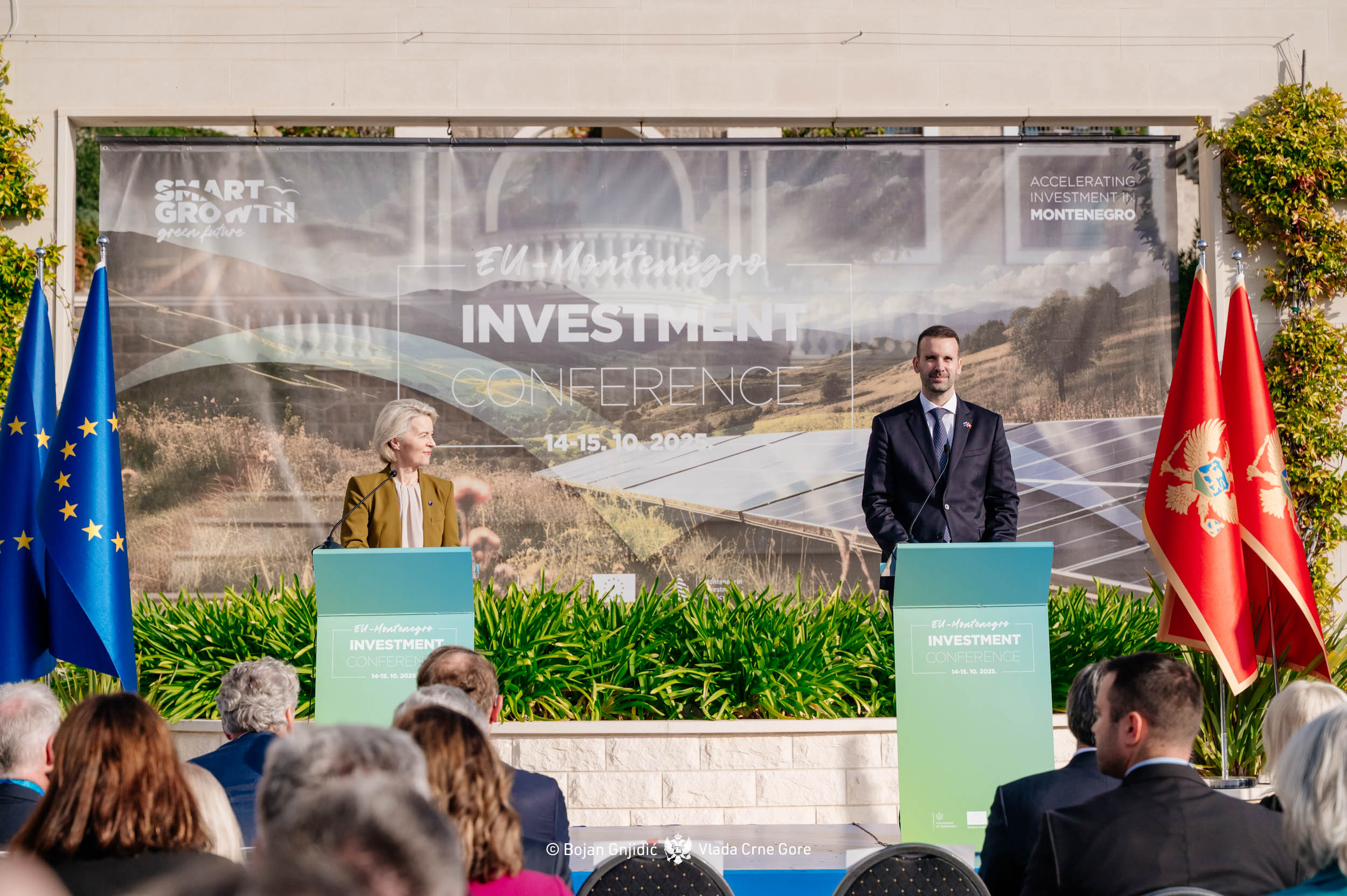 Në konferencën për shtyp në kuadër të Konferencës së Investimeve BE–Mali i Zi, kryeministri Millojko Spajiq dhe presidentja e Komisionit Evropian Ursula von der Leyen diskutuan për progresin evropian të Malit të Zi dhe projektet zhvillimore.